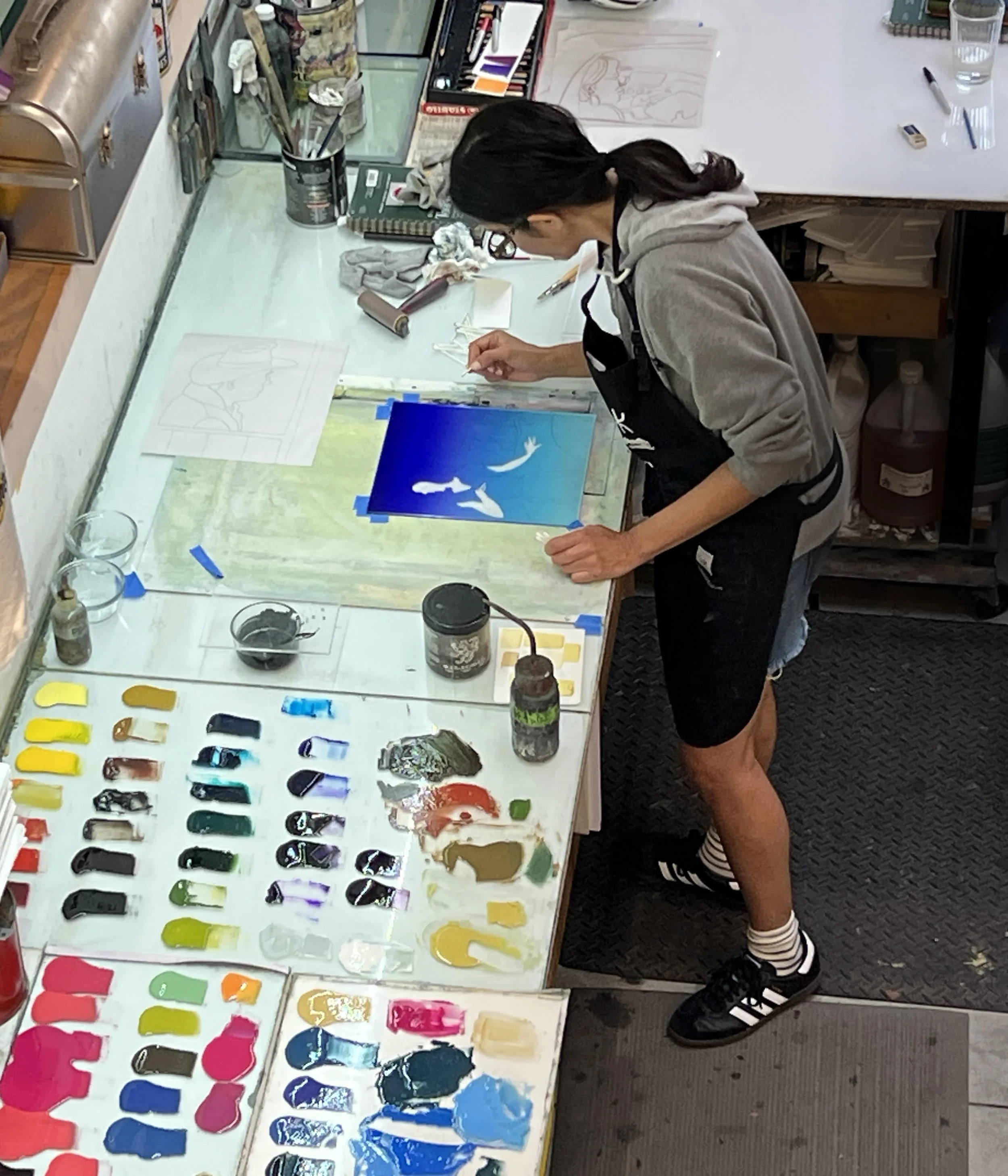 Mala Iqbal was born in the Bronx in 1973 and grew up in a household where three cultures and four languages intersected. These monotypes were influenced by and compiled from her sketchbooks, which include hundreds of drawings of fellow New Yorkers glimpsed on bus, subway, ferry and city street. Iqbal has had solo exhibitions at Soloway Gallery in Brooklyn; Ulterior Gallery, Bellwether Gallery, and PPOW in New York; Taylor University in Upland, Indiana; Twelve Gates Arts in Philadelphia; and Richard Heller Gallery in Los Angeles. Her series of collaborative paintings, made with Angela Dufresne, was shown at SUNY Purchase in October 2021, and will be exhibited at LSU in Baton Rouge in Fall 2023. Her work has been exhibited in group shows throughout the United States as well as in Australia, China, Europe, and India. Iqbal has been awarded artist residencies at the MacDowell Colony, Yaddo, The Fine Arts Work Center, and the Hermitage Artist Retreat. She received a Joan Mitchell Fellowship in 2023 and a New York Foundation for the Arts (NYFA) fellowship in Painting in 2008. Mala Iqbal lives and works in Brooklyn, NY.